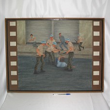 PINTURA SOBRE TELA(60X80 CM), RETRATANDO POLICIAIS ESPANCANDO UM TRABALHADOR E PERSEGUINDO MAIS DUAS PESSOAS. ATRÁS, DADOS SOBRE A OBRA E O AUTOR. POSSUI MOLDURA PINTADA, COMO UM NEGATIVO DE FOTOGRAFIA. MOLDURA EM MADEIRA (64,5X84 CM).