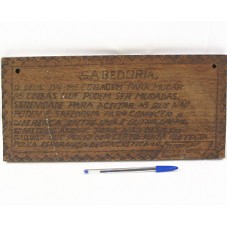 PLACA EM MADEIRA (17,5X37,5 CM), CONTENDO A INSCRIÇÃO 'SABEDORIA, Ó DEUS DAI-ME CORAGEM APRA MUDAR AS COISAS QUE PODEM SER MUDADAS, SERENIDADE PARA ACEITAR AS QUE NÃO PODEM E SABEDORIA PARA CONHECER A DIFERENÇA ENTRE UMA E OUTRA. DAI-ME, SOBRETUDO, ÂNIMO PARA NÃO DESISTIR DAQUILO QUE PENSO SER CERTO, AINDA QUE TENHA POUCA ESPERANÇA DE CONCRETIZA-LO. / TURMALINA / VALE DO JEQUETINHONHA.' ATRÁS 'ART:JLS'.