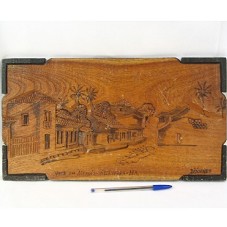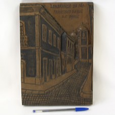 GRAVURA ENTALHADA EM MADEIRA (28X19,5 CM), RETRATANDO UMA RUA COM CONSTRUÇÕES BARROCAS E UMA IGREJA. POSSUI A INSCRIÇÃO 'LEMBRANÇA DE SÃO FRANCISCO DO SUL / S.C BRASIL'.