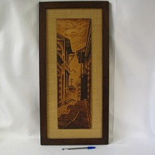 QUADRO EMOLDURANDO GRAVURA DESENHADA EM MADEIRA (50X15,5 CM), RETRATANDO A RUA DE UMA CIDADE, COM CASAS E UMA IGREJA AO FUNDO. MOLDURA (65,5X31,5 CM) EM MADEIRA ESCURA E PASSE-PARTOUT EM PALHA TRANÇADA.