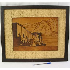 QUADRO EMOLDURANDO GRAVURA DESENHADA EM MADEIRA (27,5X37,5 CM), RETRATANDO UMA CONSTRUÇÃO, PARECIDA COM UM FORTE. MOLDURA (47X56 CM) EM MADEIRA ESCURA E PASSE-PARTOUT EM PALHA TRANÇADA.