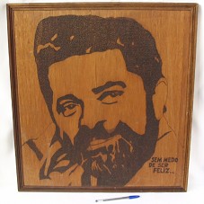 GRAVURA DESENHADA EM MADEIRA (58X53,5 CM), RETRATANDO O PRESIDENTE LULA. POSSUI A INSCRIÇÃO 'SEM MEDO DE SER FELIZ...'. ATRÁS 'ESCOLA MUNICIPAL PROFISSIONALIZANTE / ALUNO: ALEXANDRE PANNUNZIO / PROFESSORA: DIVA'. MOLDURA EM MADEIRA (63X58,5 CM) .