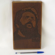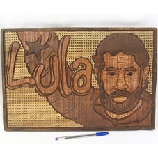 GRAVURA ENTALHADA EM MADEIRA (26X15 CM)) , RETRATANDO O PRESIDENTE LUIZ INÁCIO LULA DA SILVA. NO CANTO INFERIOR DIREITO A INSCRIÇÃO 'LULA'. ATRÁS 'PEDRO DE SOUZA JR / SETEMBRO 89 / LULA: ERGA ALTO ESTA ESTRELA DA SINCERIDADE PARA QUE IRRADIE A LUZ DA DIGNIDADE E ILUMINE OS CAMINHOS, E QUE ESTE POVO SOFRIDO, QUE PERDIDO NAS TREVAS DA MISÉRIA E OPRESSÃO, CAMINHA CABISBAIXO E SEM RUMO. / PEDRO DE SOUZA JUNIOR / COMITÊ INDEPENDENTE PRÓ LULA / J.MONTE BELO - CAMPINAS SP.'