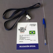 CRACHÁ (11X16,5 CM) EM PAPEL BRANCO, PLASTIFICADO, EM NOME DO 'S.E. SR. LUIZ INACIO LULA DA SILVA / PRESIDENTE DE LA REPUBLICA / Nº IDENT.: DA059649 / NºFº: 1733 / BRASIL', COM A BANDEIRA DO BRASIL E FAIXA AZUL NA PARTE INFERIOR CONTENDO A INSCRIÇÃO 'DELEGACIÓN OFICIAL'. NA PARTE SUPERIOR, 'TRANSMISIÓN DEL MANDO PRESIDENCIAL MARZO 2006 / CHILE TIEMPO DE TODOS / MICHELLE BACHELET / PRESIDENTA DE CHILE'. ATRÁS, CARIMBO COM ASSINATURA. PRESO À FITA AZUL MARINHO.