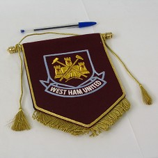 FLÂMULA (15X22,5 CM), EM TECIDO AVELUDADO, NA COR VINHO, COM FRANJAS DOURADAS. NO CENTRO, BRASÃO DO TIME INGLÊS 'WEST HAM UNITED', BORDADO EM AZUL, DOURADO E BRANCO. PRESO À BASTÃO EM METAL DOURADO, COM CORDA NA MESMA COR. ACONDICIONADO EM CAIXA DE PAPELÃO COM CINTA BRANCA E LOGOMARCA DO FABRICANTE NA TAMPA.