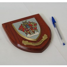 PLACA EM MADEIRA, NO FORMATO DE UM BRASÃO (15X18X2,5 CM), TENDO NO CENTRO, BRASÃO DA PREFEITURA DE NEWHAM COM A INSCRIÇÃO 'PROGRESS WITH THE PEOPLE'; E, ABAIXO DELE, 'NEWHAM'. ATRÁS, FURO PARA PENDURAR EM PAREDE.
