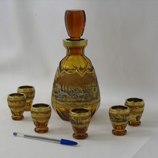 CONJUNTO PARA LICOR, COMPOSTO POR UMA GARRAFA E SEIS COPOS, EM CRISTAL NA COR ÂMBAR. GARRAFA COM TAMPA EM MESMO MATERIAL, E PINTURA DE AUTORIA DE BORILOVÁ, EM DOURADO E TONS DE MARROM, MOSTRANDO UMA CARRUAGEM PUXADA POR QUATRO CAVALOS, ANDANDO POR UMA PAISAGEM CAMPESTRE. NOS COPOS, PINTURA SÓ DA PAISAGEM. POSSUEM ETIQUETA COM NOME DO FABRICANTE, 'EGERMANN / CZECH REPUBLIC / BOHEMIA CRYSTAL / HAND MADE '. ACONDICIONADO EM CAIXA FORRADA DE VELUDO AZUL MARINHO. NA PARTE INTERNA, PLACA METÁLICA, COM A INSCRIÇÃO 'JIRI PAROUBEK / PRIME MINISTER OF THE CZECH REPUBLIC '.