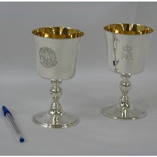 DUAS TAÇAS (15X8,5 CM) PARA VINHO, EM PRATA 925, COM INTERIOR EM PRATA DOURADA. EM UMA FACE, O BRASÃO DA REPÚBLICA FEDERATIVA DO BRASIL; NA OUTRA, O SÍMBOLO DA RAINHA ELIZABETH II. ACONDICIONADAS EM ESTOJO FORRADO DE NAPA AZUL MARINHO, COM DETALHES EM PRATA E LOGOMARCA DA RAINHA NA TAMPA. NA PARTE INTERNA, NOME DO FABRICANTE, 'WILLIAM & SON / LONDON'.
