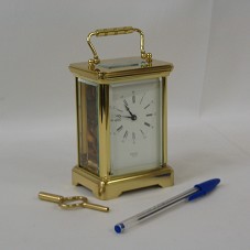 RELÓGIO ANALÓGICO (8X6X11,5 CM), DE MESA, EM METAL DOURADO, COM AS FACES E A PARTE SUPERIOR FECHADAS EM VIDRO, DEIXANDO A MAQUINARIA VISÍVEL. NUMERAÇÃO ROMANA, COM INDICAÇÃO DOS MINUTOS EM NÚMEROS ARÁBICOS. POSSUI UMA ALÇA NA PARTE SUPERIOR E DESENHO DE UMA COROA NO VIDRO. NA PARTE POSTERIOR, DUAS INICIAIS GRAVADAS 'I F' E 'MADE IN ENGLAND 11 JEWELS'. ACOMPANHA CHAVE PARA DAR CORDA NO RELÓGIO. ACONDICIONADO EM ESTOJO FORRADO DE NAPA VINHO, COM DETALHES EM DOURADO, E DESENHO DA MESMA COROA NA PARTE SUPERIOR.
