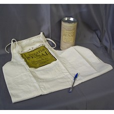 DOIS AVENTAIS IGUAIS, EM ALGODÃO CRU. NA FRENTE, BOLSO EM TECIDO BEGE, COM ESTAMPA MARROM, CONTENDO A INSCRIÇÃO 'LIVRARIA SENAI / OLIMPÍADA DO CONHECIMENTO 2006'. ACONDICIONADOS EM CAIXA CILÍNDRICA, COM TAMPA METÁLICA, FORRADA COM PAPEL EM TONS DE MARROM, COM MESMA ESTAMPA.