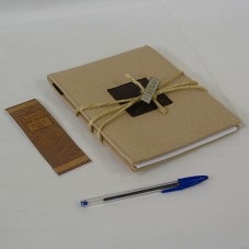 DOIS BLOCOS IGUAIS DE ANOTAÇÃO (16,5X21X1,5 CM), FORRADOS COM TECIDO DE ALGODÃO CRU, NA COR BEGE, COM UMA PLACA EM COURO MARROM NA FRENTE, CONTENDO A INSCRIÇÃO 'LIVRARIA SENAI / OLIMPÍADA DO CONHECIMENTO 2006'. AMARRADOS COM CORDA DE PALHA E UM BÓTON RETANGULAR EM METAL, COM LOGOMARCA DO 'SENAI'. ACOMPANHA DOIS MARCADORES DE PÁGINA MAGNÉTICOS, EM PAPEL, COM IMÃS NAS EXTREMIDADES.