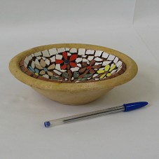 TIGELA FUNDA PEQUENA (18X18X4,5 CM), EM CERÂMICA. PARTE INTERNA TRABALHADA COM MOSAICO CERÂMICO, FORMANDO DESENHO DE FLORES. ACOMPANHA CARTÃO DO REMETENTE.