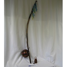 BERIMBAU (157 CM) COM MASTRO TRABALHADO COM DESENHOS GEOMÉTRICOS GRAVADOS NA MADEIRA, E A INSCRIÇÃO 'PÓLO DE CAPOEIRA'. CABAÇA TAMBÉM TRABALHADA. NA PARTE SUPERIOR DO MASTRO, FITAS DO SENHOR DO BONFIM AMARRADAS. ACOMPANHA CHOCALHO FEITO EM VIME; UMA PEDRA DE SEIXO ROLADO E UM BASTÃO PEQUENO.