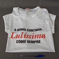 CAMISETA (TAM G) EM MALHA BRANCA, DE MANGA CURTA. NA FRENTE, INSCRIÇÃO EM PRETO E VERMELHO, 'A BAHIA CONTINUA LULÍSSIMA COMO SEMPRE'.