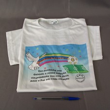 CAMISETA (TAM M) EM MALHA BRANCA, DE MANGA CURTA. NA FRENTE, ESTAMPA EM AZUL, VERDE E BRANCO, MOSTRANDO UMA POMBA E UMA BOLA DE FUTEBOL UNIDOS POR UM ARCO-ÍRIS E UM CAMPO DE FUTEBOL 'BRASIL / ALEMANHA', COM A INSCRIÇÃO 'NOSSA SELEÇÃO EM BUSCA DO HEXA / VOA POMBINHA VOA / GUIANDO A NOSSA SELEÇÃO / VOA, POMBINHA VOA COM DEUS / AMOR E PAZ EM CADA CORAÇÃO'. POSSUI UM SELO 'R.M.N. / REPRODUÇÃO PROIBIDA / PATENTE REGISTRADA'. ATRÁS, UM POEMA DE AUTORIA DO REMETENTE, SOBRE O BRASIL NA COPA DO MUNDO.