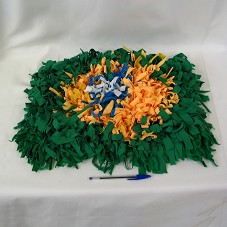 TAPETE (47X33 CM) EM RETALHO DE TECIDO, NAS CORES VERDE, AMARELO, AZUL E BRANCO, EM ALUSÃO À BANDEIRA NACIONAL. POSSUI BASE EM JUTA.