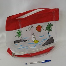 SACOLA EM PLÁSTICO TRANSPARENTE, COM A PARTE SUPERIOR E INFERIOR EM VERMELHO. POSSUI ALÇAS MEDIANAS, FECHO EM ZÍPER, E BOLSO NA PARTE INFERIOR. NA FRENTE, DESENHO DE UMAS PALMEIRAS E UM BARCO À VELA.