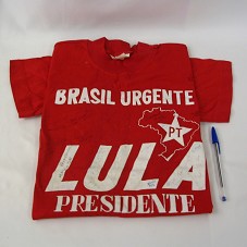 CAMISETA (TAM M) EM MALHA VERMELHA, DE MANGA CURTA. NA FRENTE, ESTAMPA COM A INSCRIÇÃO 'BRASIL URGENTE / LULA PRESIDENTE'. POSSUI O DESENHO DO MAPA DO BRASIL, COM A ESTRELA DO PT DENTRO, E DIVERSAS ASSINATURAS EM CANETA ESFEROGRÁFICA E HIDROCOR.