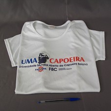 CAMISETA (TAM XG) EM MALHA BRANCA, DE MANGA CURTA. NA FRENTE, ESTAMPA COM A INSCRIÇÃO 'UMA CAPOEIRA / UNIVERSIDADE MUNDIAL ABERTA DA CAPOEIRA BAIANA / FACCEBA / FBC FEDERAÇÃO BAHIANA DE CAPOEIRA'.
