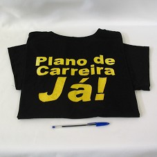 CAMISETA EM MALHA PRETA. NA FRENTE, ESTAMPA EM AMARELO, 'PLANO DE CARREIRA JÁ'. ATRÁS, EM BRANCO, 'SERVIDORES DO MINISTÉRIO DOS TRANSPORTES / SINDSEP SINDICATO DOS SERVIDORES PÚBLICOS FEDERAIS NO DF / ASMT'.