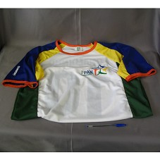 CAMISETA (TAM GG) EM MALHA BRANCA, COM LATERAIS VERDES E MANGAS EM AMARELO E AZUL. NA FRENTE, A INSCRIÇÃO 'VILA PAN AMERICANA' E LOGOMARCA (CINCO FIGURAS HUMANAS ESTILIZADAS, FORMANDO UMA ESTRELA). ATRÁS, 'RONALDINHO / 10'.