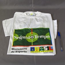 CAMISETA (TAM P) EM MALHA BRANCA. NA FRENTE, LOGOMARCA DO 'PROGRAMA SEGUNDO TEMPO' E A INSCRIÇÃO 'MINISTÉRIO DO ESPORTE / BRASIL UM PAÍS DE TODOS / GOVERNO FEDERAL'. ATRÁS, LOGOMARCA DO 'PROGRAMA FOME ZERO'.