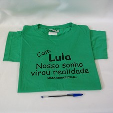 CAMISETA (TAM G) EM MALHA VERDE. NA FRENTE, A INSCRIÇÃO 'COM LULA NOSSO SONHO VIROU REALIDADE / MATA-MOSQUITO-RJ'.