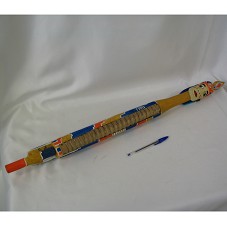 CASACA (6X6X77 CM), INSTRUMENTO MUSICAL TIPO RECO-RECO, CONFECCIONADO EM MADEIRA E BAMBU. NA PARTE SUPERIOR, A FACE DE UM ÍNDIO, ESCULPIDA NA MADEIRA; E, EM CIMA DELA, UMA PLAQUETA METÁLICA COM A INSCRIÇÃO 'CODESA' E LOGOMARCA. INSTRUMENTO PINTADO NAS CORES AZUL, AMARELO E LARANJA. NA PARTE INFERIOR, 'MESTRE VITALINO 2006'; ATRÁS, 'BARRA DO JUCU-ES'. ACOMPANHA BASTÃO, ENCAIXADO NA PARTE INFERIOR, PARA TOCAR O INSTRUMENTO.