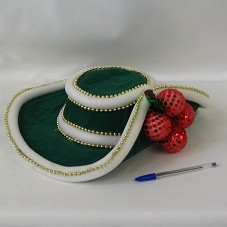 CHAPÉU EM PLÁSTICO TRANÇADO, COMO PALHA, REVESTIDO DE VELUDO VERDE, COM BORDAS EM ESPUMAS BRANCAS E CORDÃO COM ESFERAS DOURADAS. POSSUI UMA DAS LATERAIS COLADAS NA PARTE SUPERIOR, COM TRÊS BOLAS DE ISOPOR REVESTIDAS EM TECIDO VERMELHO COLADAS NA PARTE EXTERNA. ALGUMAS PARTES ESTÃO DESCOLANDO.