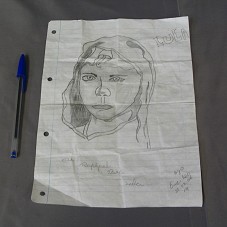 DESENHO (17X12 CM) EM GRAFITE, EM PAPEL PAUTADO DE FICHÁRIO, RETRATANDO UM ROSTO FEMININO USANDO UM CAPUZ. NA PARTE SUPERIOR, 'LULA'; NA INFERIOR, 'DE RAPHAEL PARA LULA'.