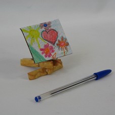 DESENHO (5,5X7,5 CM) SOBRE PAPEL BRANCO, COLADO EM PAPELÃO MICROONDULADO AZUL. DESENHO INFANTIL MOSTRANDO FLORES, UM SOL E UM CORAÇÃO. NA PARTE POSTERIOR, ETIQUETA COM A INSCRIÇÃO 'TELAS PINTADAS POR CRIANÇAS DE 5 A 8 ANOS / FUNDAÇÃO XUXA MENEGHEL', COM ENDEREÇO E CONTATOS. ACOMPANHA MINI-CAVALETE, CONFECCIONADO COM PREGADORES DE ROUPA, EM MADEIRA. O DESENHO ESTAVA COLADO NELE E CHEGOU AQUI DESCOLADO.