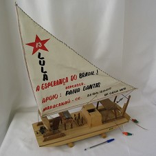 MINIATURA DE JANGADA (64X17X43 CM) EM MADEIRA, COM VELA EM TECIDO BRANCO, CONTENDO A INSCRIÇÃO '13 / LULA / A ESPERANÇA DO BRASIL! / APOIO: VEREADOR PAIVA DANTAS / MARACANAÚ - CE. / 31/03/2000 / ART. CLÁUDIO MOTA'; E, NAS LATERAIS, A BANDEIRA NACIONAL E A ESTRELA DO PT - PARTIDO DOS TRABALHADORES.