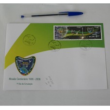 ENVELOPE E SELOS DA 'MISSÃO CENTENÁRIO - 1906/2006', EM EMISSÃO COMEMORATIVA, ACOMPANHADOS DO 'EDITAL 2-2006' COM HISTÓRICO SOBRE A MISSÃO E DADOS TÉCNICOS DOS OBJETOS. SELO POSTAL COMPOSTO POR TRÊS PARTES: O PRIMEIRO, EM REFERÊNCIA À MISSÃO E À AEB, DESTACANDO A REPRESENTAÇÃO DO 14 BIS; O SEGUNDO, REPRESENTANDO A NAVE ESPACIAL SOYUZ E O FOGUETE LANÇADOR DE MESMO NOME, SIMULANDO O INÍCIO DA MISSÃO; O TERCEIRO, FOCALIZANDO A ESTAÇÃO ESPACIAL INTERNACIONAL E A LOGOMARCA DA MISSÃO CENTENÁRIO, RESSALTANDO AS INSTITUIÇÕES ENVOLVIDAS. OS TRÊS SELOS ESTÃO LIGADOS POR UMA FAIXA VERDE-AMARELA, REPRESENTANDO A PRESENÇA DO BRASIL NAS PESQUISAS CIENTÍFICAS ESPACIAIS INERENTES À MISSÃO. ACONDICIONADO EM PASTA DE COURO PRETO, COM LOGOMARCA DA EMPRESA BRASILEIRA DE CORREIOS E TELÉGRAFOS, NA CAPA.
