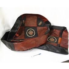 TRÊS PUFES EM COURO, DE TAMANHO MÉDIO, NAS CORES MARROM E PRETO, FORMANDO UM XADREZ. DOIS EM FORMATO CIRCULAR E UM EM FORMATO RETANGULAR. NA PARTE SUPERIOR, DETALHES BORDADOS EM COURO, COM MOTIVOS FLORAIS.