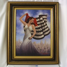 PINTURA SOBRE TELA (80X60 CM), RETRATANDO UMA MULHER COM VESTIDO BRANCO, SEGURANDO A BANDEIRA DO ESTADO DE SÃO PAULO, COMO SE ESTIVESSE DANÇANDO. AO FUNDO, VISTA DA CIDADE, COM CONCENTRAÇÃO DE EDIFICAÇÕES. PINTURA EM TONS DE AZUL, MARROM, BRANCO E VERMELHO. NO CANTO INFERIOR DIREITO, ASSINATURA DO ARTISTA 'HJ SANTOS 2006'. MOLDURA (106,5X87 CM) EM MADEIRA TRABALHADA, LAMINADA DE DOURADO. ATRÁS, A INSCRIÇÃO 'ÓLEO S/ TELA / T. LIBERDADE / A. HAROLDO J. SANTOS / S. PAULO 2006 BRASIL GUARULHOS / AO PRESIDENTE LUIS INÁCIO LULA DA SILVA / 29 III 06'.