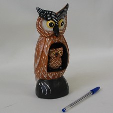 ESCULTURA (20 CM) EM MADEIRA, RETRATANDO UMA CORUJA SOBRE UMA PEDRA PRETA, ACOMPANHADA DE UM FILHOTE. POSSUI A PARTE DO PEITO/BARRIGA OCA, ONDE O FILHOTE É COLOCADO. PINTADA EM TONS DE MARROM, COM DETALHES BRANCOS.