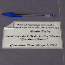 PLACA (16X10 CM) EM PRATA, COM INTERIOR FOSQUEADO. POSSUI A INSCRIÇÃO 'NÃO HÁ MUDANÇA SEM SONHO COMO NÃO HÁ SONHO SEM ESPERANÇA / PAULO FREIRE / LEMBRANÇA DA E.M. DO JARDIM SILVESTRE GRACILIANO RAMOS / GUARULHOS, 29 DE MARÇO DE 2006.'. ACONDICIONADA EM ESTOJO FORRADO DE LYCRA AZUL MARINHO.