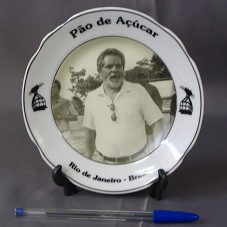PRATO DECORATIVO (15,5 CM) EM PORCELANA BRANCA, COM A FOTOGRAFIA DO PRESIDENTE LUIZ INÁCIO LULA DA SILVA ESTAMPADA NO FUNDO. POSSUI NAS BORDAS A INSCRIÇÃO 'PÃO DE AÇÚCAR / RIO DE JANEIRO - BRASIL'. ACOMPANHA SUPORTE FEITO EM PLÁSTICO PRETO, INGRESSOS PARA O BONDINHO DO PÃO DE AÇÚCAR E CARTÃO DE VISITA DE 'BEATRIZ RIBEIRO'. ACONDICIONADO EM CAIXA DE PAPELÃO (19X18 CM).