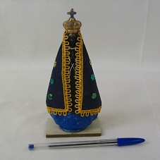IMAGEM (16,5X8 CM) DE NOSSA SENHORA APARECIDA, EM RESINA, COM A BASE EM MADEIRA (7,5X5 CM). POSSUI MANTO EM VELUDO AZUL MARINHO, COM DETALHES DOURADOS, FLORES E FOLHAS EM MIÇANGAS E LANTEJOULA. POSSUI PAPEL COLADO COM A INSCRIÇÃO 'N.SRA.APARECIDA / GUARDE ESTA CASA'.