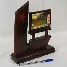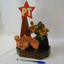 ARTESANATO EM MADEIRA (25X18X10 CM) COM A BASE (4X19X12 CM) EM MESMO MATERIAL. POSSUI UM PILAR COM A ESTRELA DO PT, UM TRONCO DE MADEIRA COM FOLHAS E FLORES E O MAPA DO MUNICÍPIO DE SUMARÉ COM A INSCRIÇÃO 'QUE ESTE PEDAÇO DE TERRA, SEJA O CHÃO FIRME PARA A REALIZAÇÃO DOS NOSSOS SONHOS. / PT / SUMARÉ / AGOSTO / 1999'.