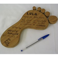 ARTESANATO EM MADEIRA (29X13,5X1,5 CM), NO FORMATO DE UM PÉ. POSSUI A INSCRIÇÃO 'LULA / OBRIGADO PELA VISITA / TUA VINDA FOI IMPORTANTE PARA LEVAR RIO DO SUL A CAMINHO DA FELICIDADE / 13/08/1992 / FRENTE POPULAR / RIO DO SUL SC / PT/PSB/PSDB'. ATRÁS UM ADESIVO 'JAILSON / FRENTE POPULAR'.