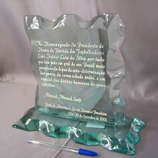 PLACA EM VIDRO (23X21X2 CM), COM AS BORDAS LASCADAS, PRESA À BASE (29X11X3 CM) DE MESMO MATERIAL. POSSUI O SÍMBOLO DA 'JUNTA DE ASSISTÊNCIA SOCIAL ISLÂMICA BRASILEIRA', AO FUNDO, E A INSCRIÇÃO 'AO HOMENAGEADO SR. PRESIDENTE DE HONRA DO PARTIDO DOS TRABALHADORES LUIZ INÁCIO LULA DA SILVA POR TUDO QUE TEM FEITO EM PROL DE UM BRASIL MAIS PROMISSOR, DA DEFESA DA AUTO-DETERMINAÇÃO DOS POVOS, DA COMUNIDADE ÁRABE, E UM ESPECIAL DOS DIREITOS HUMANOS DO POVO PALESTINO. / AHMAD AHMAD SAIFI / JUNTA DE ASSISTÊNCIA SOCIAL ISLÂMICA BRASILEIRA / S.B.C. 20 DE SETEMBRO DE 2001'.