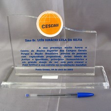 PLACA EM ACRÍLICO (16X20X1,5 CM) COM A INSCRIÇÃO 'CESCAGE / ILMO SR. LUÍS IGNÁCIO LULA DA SILVA / A SUA PRESENÇA MUITO HONRA O CENTRO DE ENSINO SUPERIOR DOS CAMPOS GERAIS. PORQUE A NAÇÃO BRASILEIRA PRECISA DE PESSOAS COM CAPACIDADE PROPOSITIVA, FORTES IDEAIS DE JUSTIÇA E IGUALDADE, PRINCÍPIOS HUMANITÁRIOS E UM GRANDE DESEJO DE VER ESTE PAÍS CRESCER E FAZER BRILHAR A SUA ESTRELA NA CONSTELAÇÃO MUNDIAL. / PONTA GROSSA, 04 DE ABRIL DE 2002.' COLADA EM BASE (26X9X2 CM) DE MESMO MATERIAL.