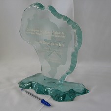 PLACA EM VIDRO (23X25X2 CM), COM AS BORDAS LASCADAS, NO FORMATO DO MAPA DO BRASIL, PRESA À BASE DE MESMO MATERIAL (22X11,5X3 CM). POSSUI O MAPA DO BRASIL E A ESTRELA DO PT DESENHADOS AO FUNDO, E A INSCRIÇÃO 'QUE NINGUÉM JAMAIS OUSE DUVIDAR DA CAPACIDADE DE LUTA DA CLASSE TRABALHADORA / 1980 / LUIZ INÁCIO LULA DA SILVA / DIRETÓRIO MUNICIPAL DO PARTIDO DOS TRABALHADORES SBC / PRESIDENTE / JOSÉ ALBINO DE MELO / 27/10/2002'.