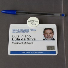 CRACHÁ EM PLÁSTICO BRANCO, COM FOTOGRAFIA DO PRESIDENTE LULA E A INSCRIÇÃO 'WORLD ECONOMIC FORUM ON LATIN AMERICA / LUIZ INIACO LULA DA SILVA / PRESIDENT OF BRAZIL / SAO PAULO, 5 - 6 APRIL 2006'.