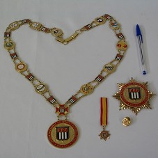 ORDEM NACIONAL DO MÉRITO FUTEBOLÍSTICO DA FEDERAÇÃO PAULISTA DE FUTEBOL, COMPOSTA POR: UM GRANDE COLAR, EM METAL DOURADO, TENDO UMA MEDALHA COM SÍMBOLO DA FEDERAÇÃO COMO PINGENTE, CORDÃO COMPOSTO POR MESMO EMBLEMA, INTERCALADO COM BRASÕES DOS TIMES PAULISTAS DE FUTEBOL; UMA PLACA, COM MESMA INSÍGNIA, LADEADA POR RAIOS DOURADOS; UM BÓTON DA INSÍGNIA; E UMA MINIATURA PRESA À FITA VERMELHA E AMARELA. ACOMPANHA CÓPIA DO CERTIFICADO. ACONDICIONADO EM ESTOJO FORRADO DE VELUDO VERMELHO.