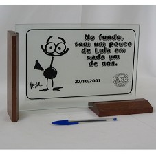 PLACA (30X20 CM) EM VIDRO, COM INTERIOR JATEADO, POSSUINDO DESENHO DO PERSONAGEM 'GRAÚNA', AVE DA CAATINGA E ETERNA CRÍTICA DO SUL MARAVILHA, EM PRETO, ASSINADO POR 'HENFIL'; E A INSCRIÇÃO 'NO FUNDO, TEM UM POUCO DE LULA EM CADA UM DE NÓS. 27/10/2001'. NO CANTO INFERIOR DIREITO, LOGOMARCA DO 'SINDICATO DOS METALÚRGICOS DO ABC / FILIADO À CUT'. POSSUI BASE INFERIOR E LATERAL EM MADEIRA.