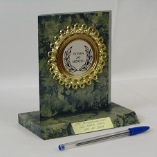 PLACA (13X15X1,5 CM) EM MDF COM PINTURA MARMORIZADA, NA COR VERDE COM SOBRETONS, TENDO AO CENTRO, ROSETA EM PLÁSTICO DOURADO, IMITANDO METAL, COM MEDALHA EM ALUMÍNIO POLIDO CONTENDO A INSCRIÇÃO 'HONRA AO MÉRITO'. FIXADA EM BASE DE MESMO MATERIAL, COM MESMO ACABAMENTO, ONDE HÁ UMA PLACA COM A GRAVAÇÃO '23º ANIVERSÁRIO DA AMA-ABC / 18-10-2001'.