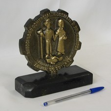 PLACA CIRCULAR (14 CM), EM BRONZE, COM DESENHO DE UM CASAL DE TRABALHADORES RURAIS EM ALTO RELEVO, E A INSCRIÇÃO 'ASSOCIAÇÃO COMERCIAL INDUSTRIAL E DE SERVIÇOS / FUNDADA EM 20 JUN 69 / FAXINAL DO SOTURNO / RS'. FIXADA EM BASE DE MADEIRA, PINTADA DE PRETA (16,5X6X2,5 CM).