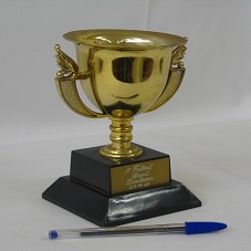 TROFÉU EM PLÁSTICO DOURADO, FORMATO DE UMA TAÇA (10,8 CM), COM DUAS ALÇAS LATERAIS, COM MOTIVOS ALADOS. FIXADO EM BASE DE PLÁSTICO PRETO (11X11X5 CM), ONDE HÁ UMA PLACA COM A INSCRIÇÃO '1º FESTIVAL GOSPEL / DIADEMA / 25.11.95'.